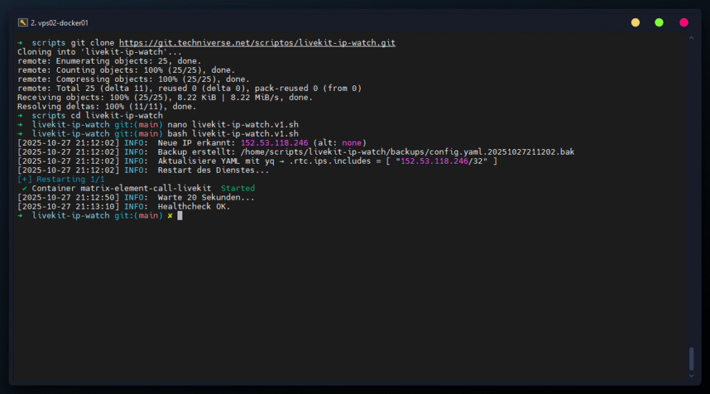 ➜ bash livekit-ip-watch.v1.sh [2025-10-27 19:56:30] INFO: Neue IP erkannt: 152.53.118.246 (alt: none) [2025-10-27 19:56:30] INFO: Backup erstellt: /home/scripts/livekit-ip-watch/backups/config.yaml.20251027195630.bak [2025-10-27 19:56:30] WARN: yq nicht gefunden – Fallback-Editor wird verwendet. [2025-10-27 19:56:30] INFO: Restart des Dienstes... [+] Restarting 1/1 ✔ Container matrix-element-call-livekit Started 46.8s [2025-10-27 19:57:17] INFO: Warte 20 Sekunden... [2025-10-27 19:57:37] INFO: Healthcheck OK.