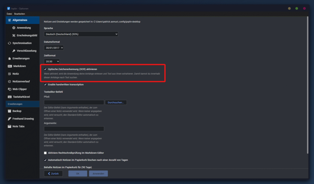 Damit kann Joplin Text aus Bildern auslesen – super praktisch, wenn du in Screenshots oder Diagrammen nach bestimmten Begriffen suchst.