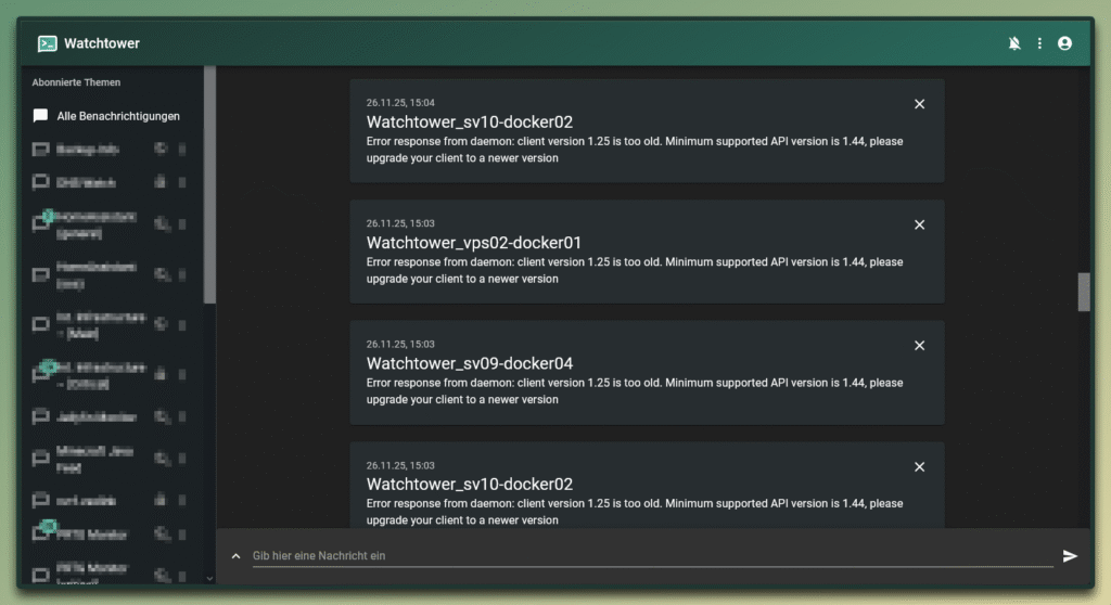 Im Netz habe ich dann gelesen, dass Docker ab Version 29 zwingend die API Version 1.44 oder neuer verlangt. Dadurch brechen plötzlich Tools, die noch auf älteren API-Versionen laufen – unter anderem Watchtower. Da ich am Vormittag Updates gemacht hatte, war ich natürlich auch unmittelbar davon betroffen.