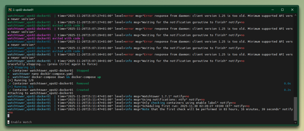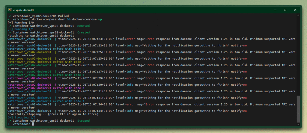 Watchtower selbst nutzt standardmäßig API Version 1.25. Und genau das führt zum Fehler.
